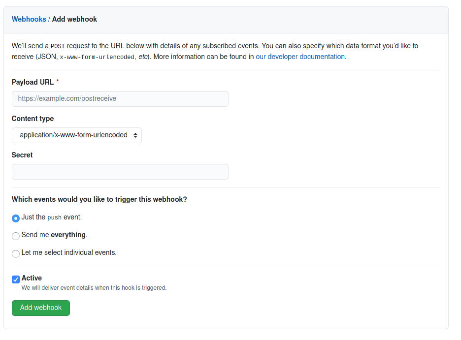 其他的你可以按需配置一下。然后,点击 Add webhook 就大功告成了。此时的 Webhook 就会发一个请求跑一下,如果返回结果没有问题,我们的配置就成功了。